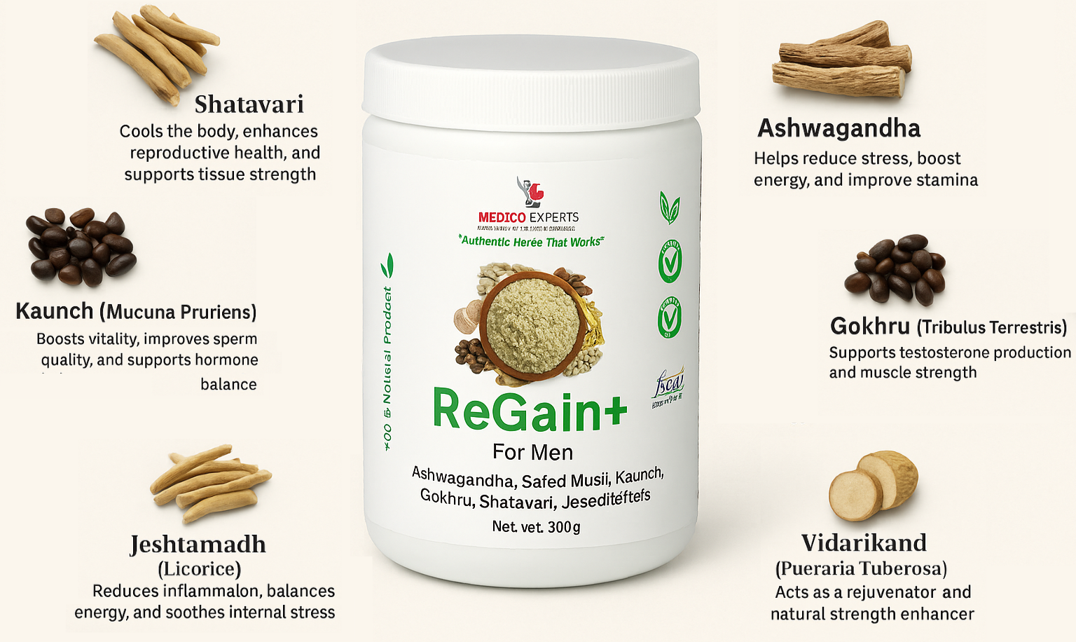 ReGain+ is a powerful Ayurvedic blend of 12+ herbs like Ashwagandha, Safed Musli, Kaunch, Shatavari, and Vidarikand — traditionally used to support male stamina, testosterone balance, and vitality. Unlike chemical stimulants, ReGain+ works holistically to boost performance, reduce stress, and restore energy levels naturally.