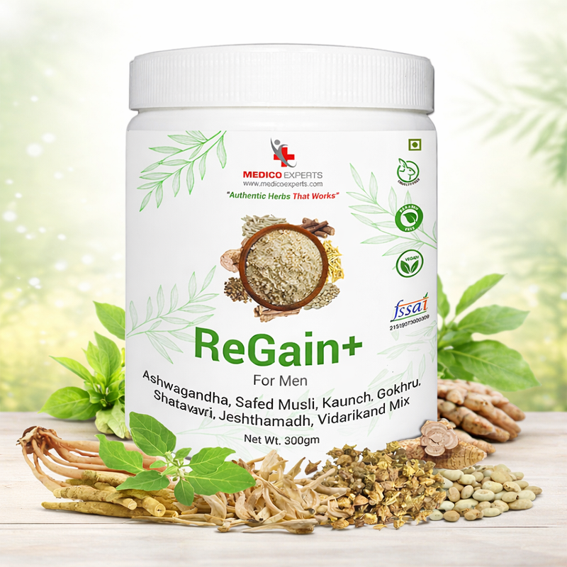 ReGain+ powder is formulated with 7 powerful Ayurvedic herbs known for their rejuvenating (Rasayana) properties.